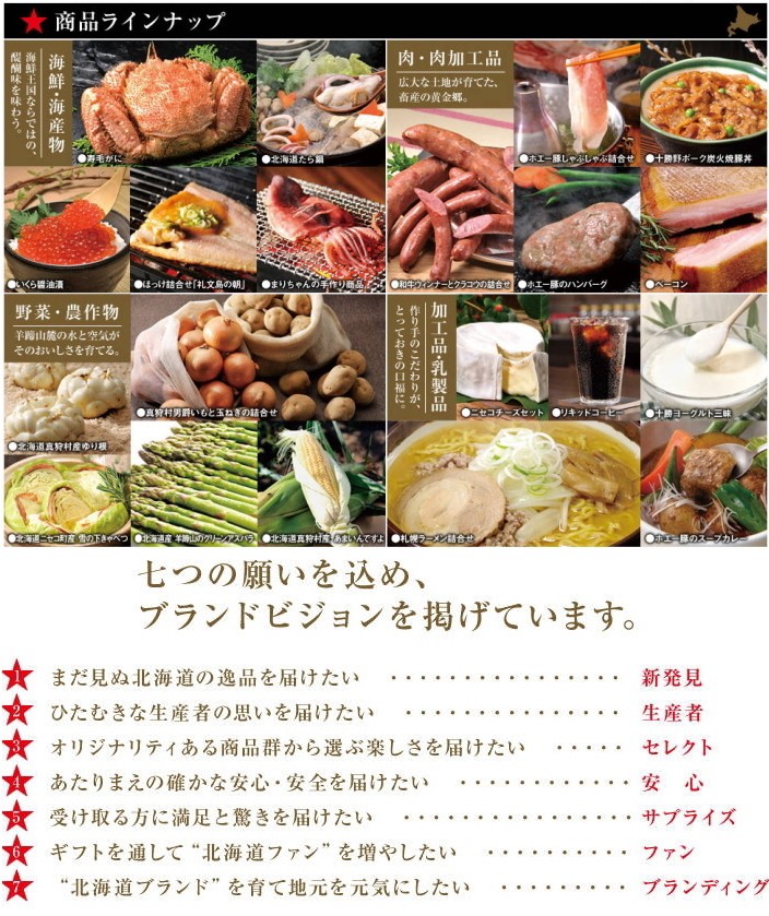 全国で人気の北海道ブランド。そのかくれた逸品を発掘し、生産者の顔、こだわり、想い、産地の特徴など、ブランドの背景にあるストーリーを語りながら届けるギフト。それが「北海道七つ星ギフト」です。ご好評をいただき、充実のラインナップ・ワイド版で登場しました。全国の物産展でも絶大な人気を誇る、北海道の食の決定版です。 【商品内容】 ●掲載点数:約100点 好みがわからない、どんなものを贈ったらいいか迷う・・・そんな時には「カタログ式ギフト」を贈って選ぶ楽しみも一緒にお届け。