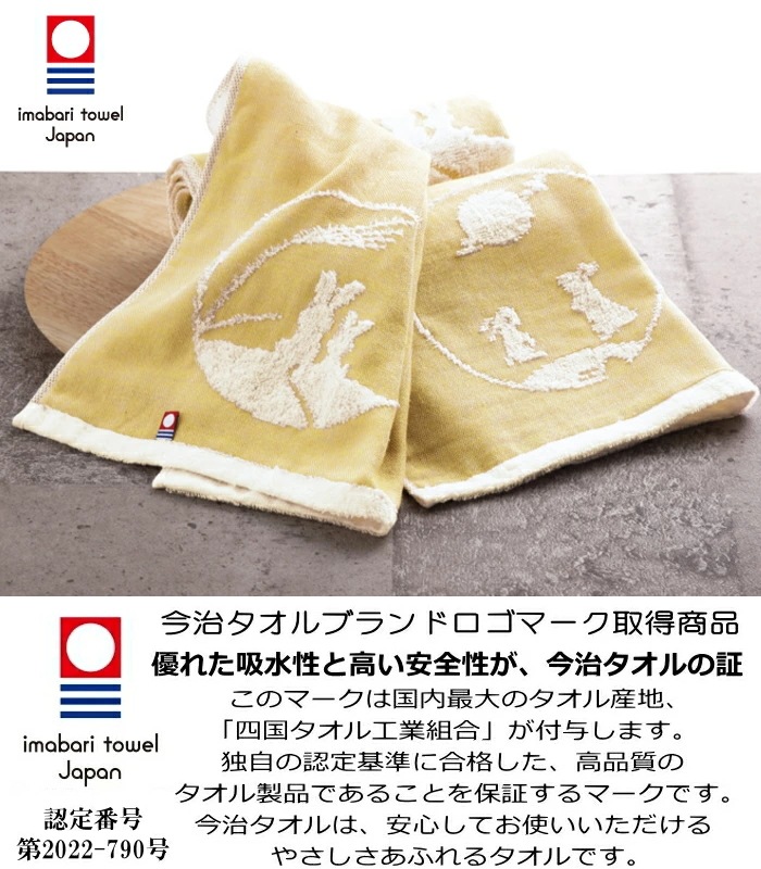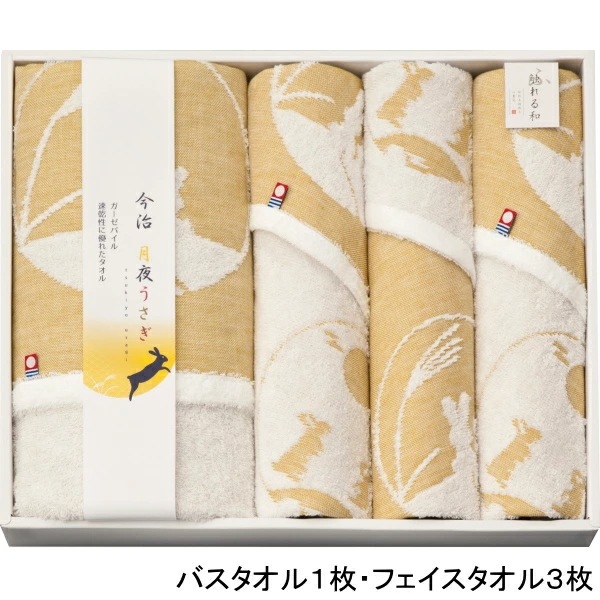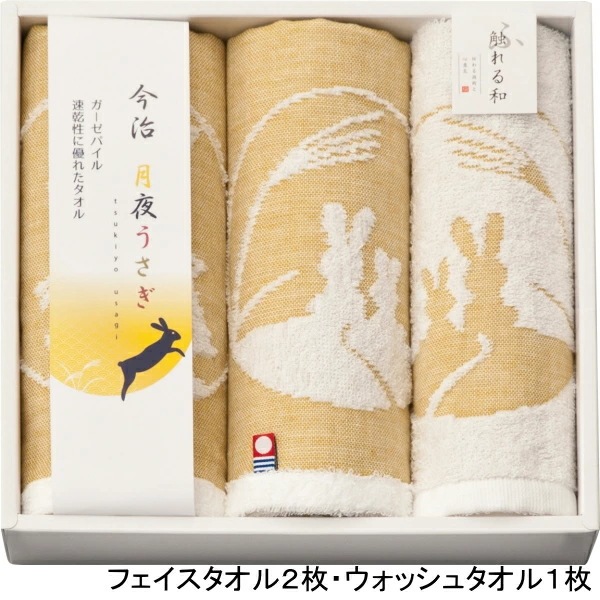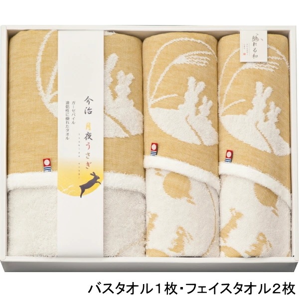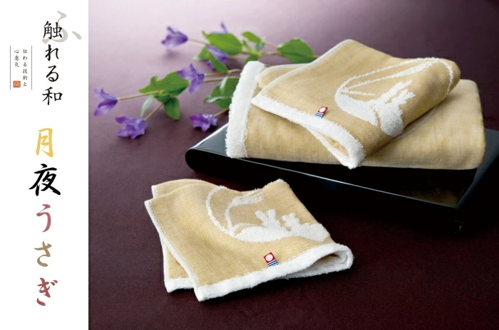 月夜に浮かぶ「うさぎ」を今治のガーゼ織ジャガード技術により表現しております。吸水・速乾性に優れた今治タオルを感謝の気持ちを込めて贈ります。