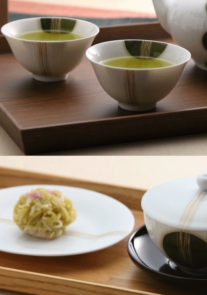 松葉のように繊細なレリーフに常盤色丸紋と金銀飾を施しました。和にはもちろん、洋の空間にも溶け込むリーズです。