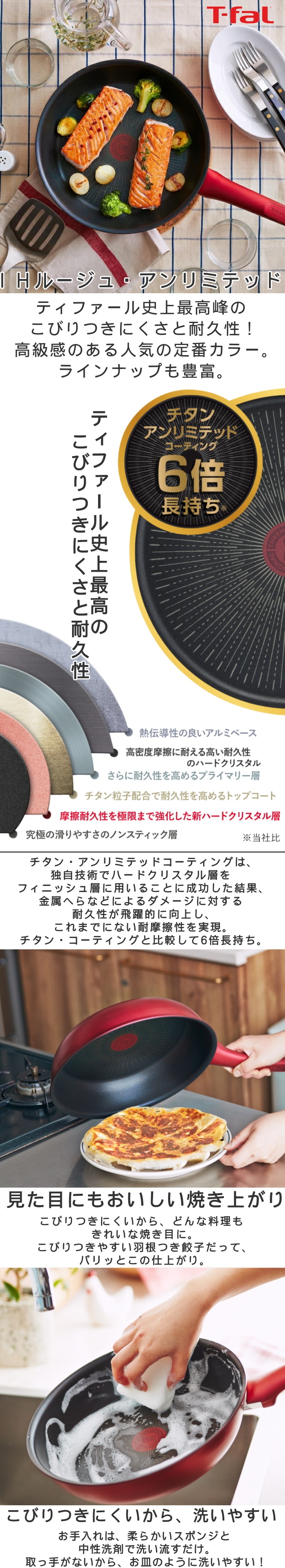チタンコーティングで金属ヘラ使用可能で、耐久性が大幅に向上。