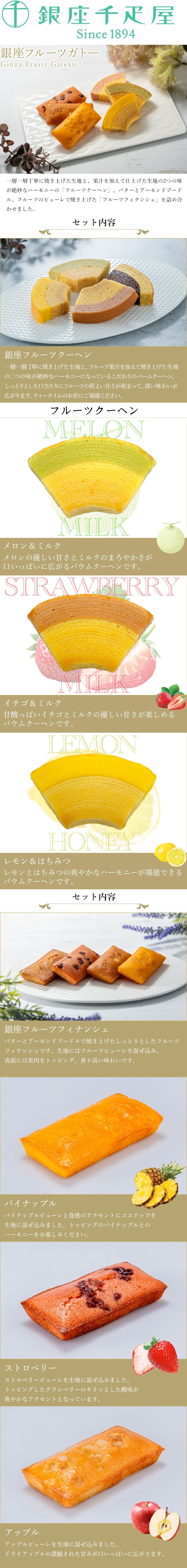商品:銀座フルーツクーヘン(メロン&ミルク・イチゴ&ミルク・レモン&はちみつ)・銀座フルーツフィナンシェ(パイナップル・ストロベリー・アップル)×各2