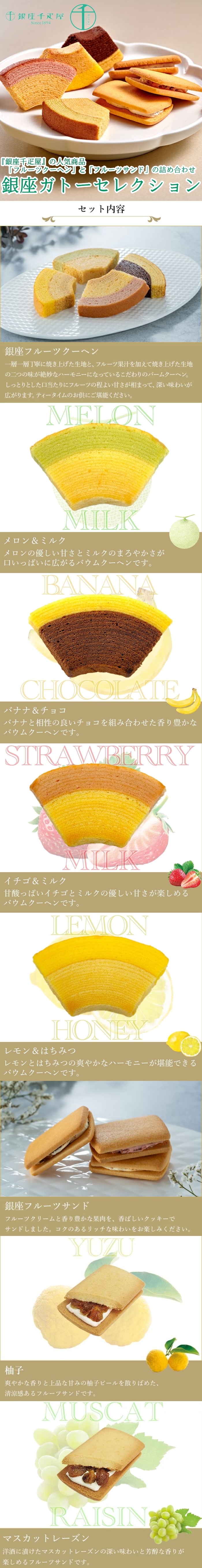 商品:銀座フルーツクーヘン(メロン&ミルク・バナナ&チョコ)・銀座フルーツサンド(マスカットレーズン)×各3、銀座フルーツクーヘン(イチゴ&ミルク・レモン&はちみつ)・銀座フルーツサンド(柚子)×各2