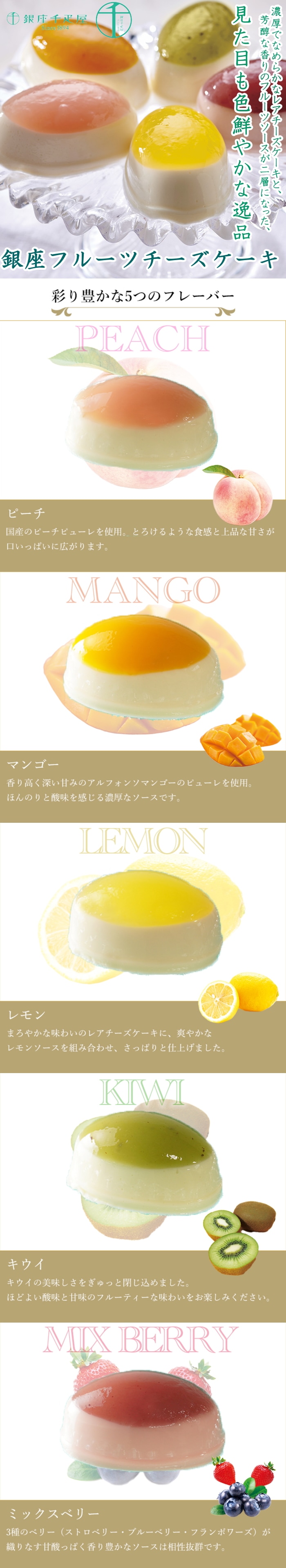 商品:銀座フルーツチーズケーキ(ピーチ、マンゴー、レモン)各60g×2、銀座フルーツチーズケーキ(キウイ、ミックスベリー)各60g